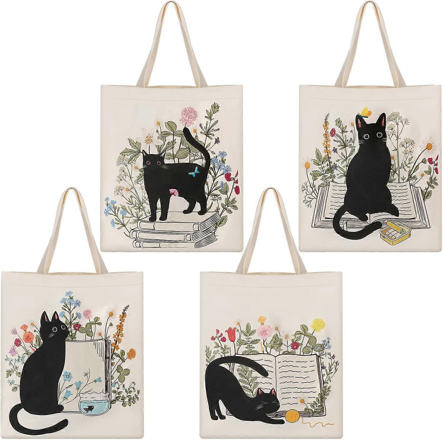 4 Pcs Canvas Tote Bag for Women Floral Black Cat Canvas Tote Aesthetic Reusable Grocery Bags Cute Gifts for Cat Lover
