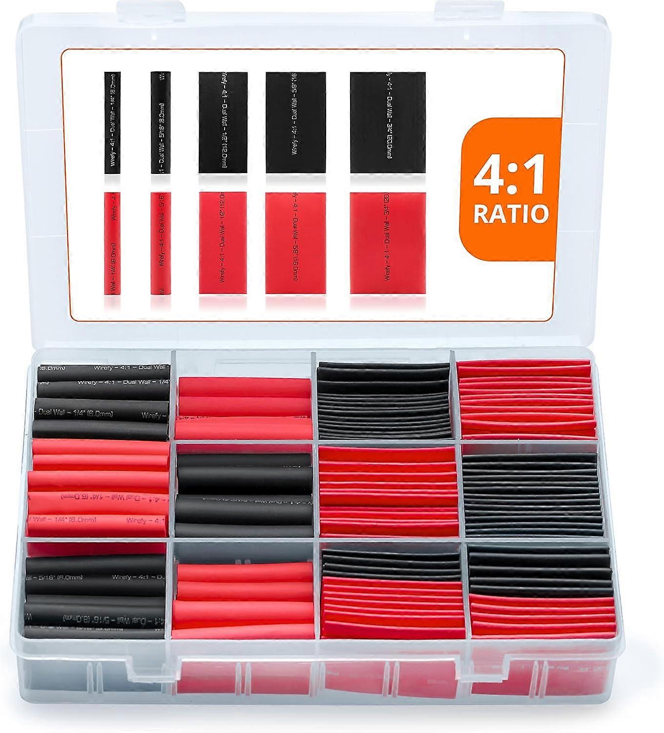 Heat shrink tubing kit (190 pieces) - 4:1 shrink ratio with adhesive - Adhesive-backed heat shrink tubing - Black and red color scheme -