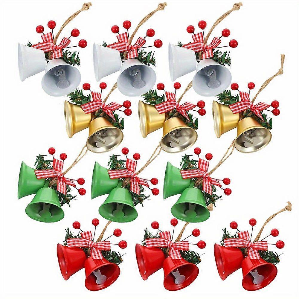 12pcs Cast Iron Christmas Bells Decorations with Red & White Gingham Bow & Greenery - Durable Indoor/Outdoor Hanging Dec [jkw]