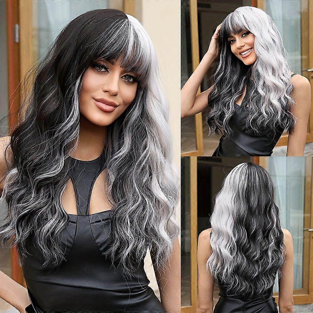 Elegant 22-Inch Two-Tone Black & White Wig for Women - Water Wave Synthetic Hair with Bangs, Perfect for Cosplay & Daily [jkw]