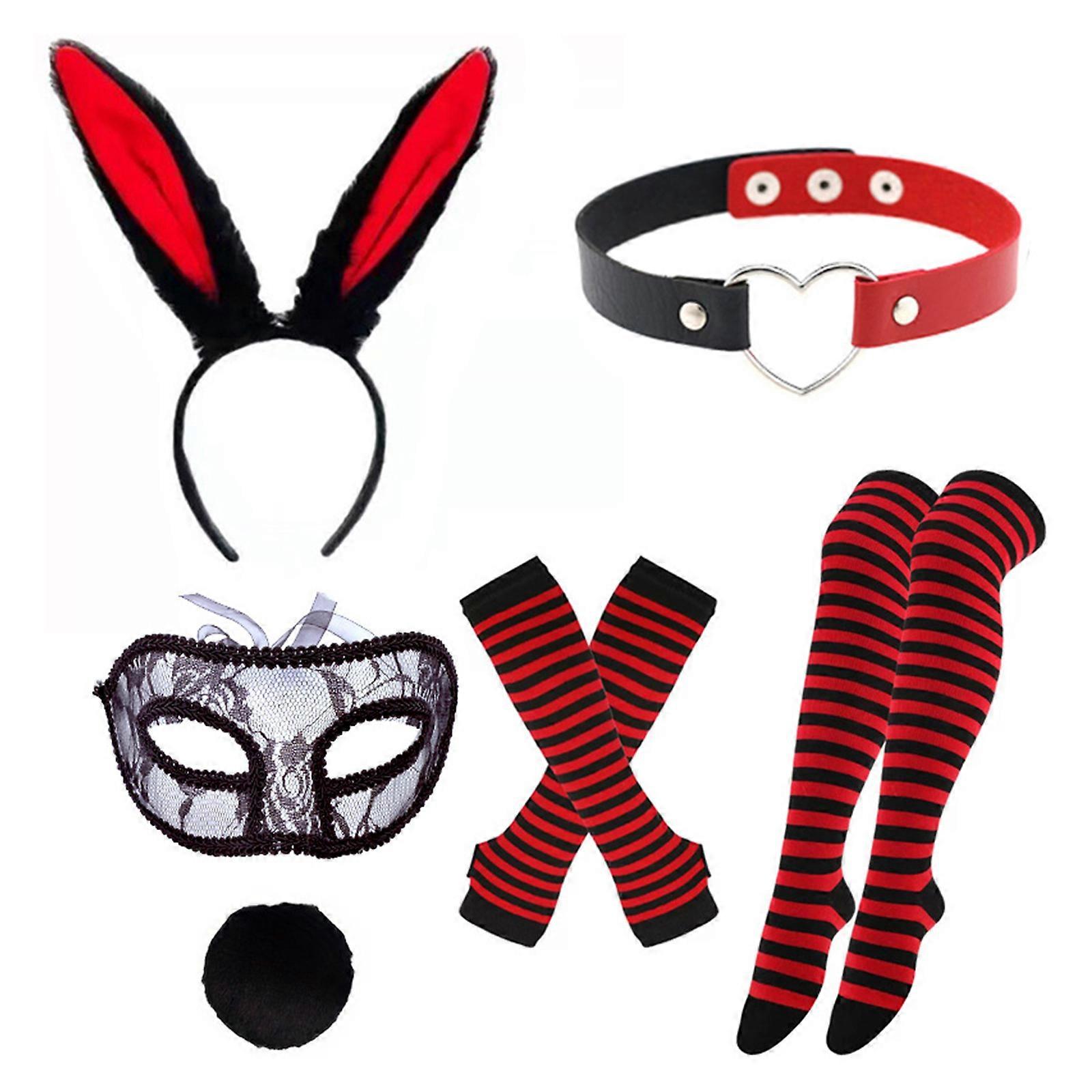 Easter Bunnies Costume Accessories Set Bunnies Ears Headband,Choker,Tail and Stripe Stocking Halloween Cosplay Costume Black and red