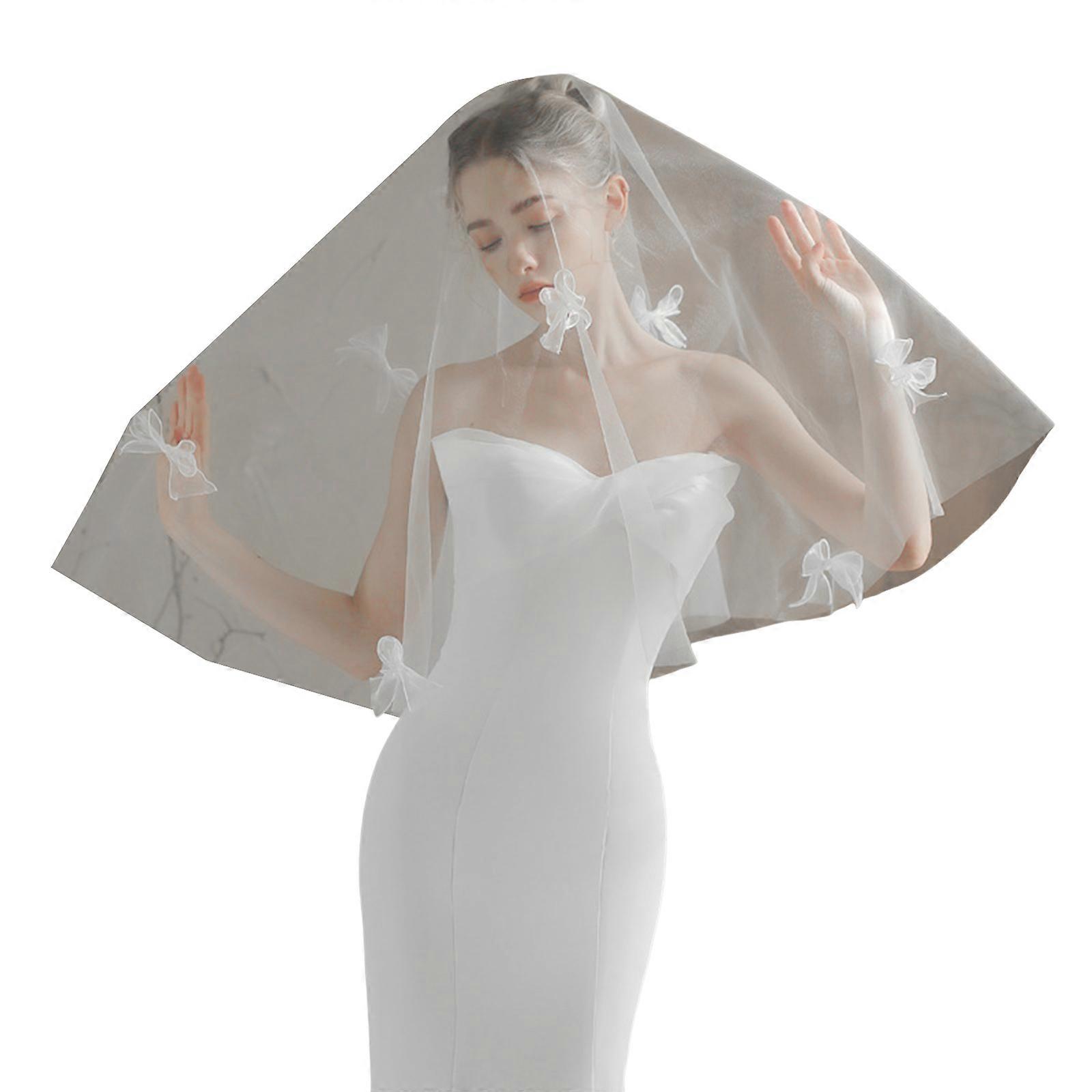 Short Bridal Veil White Tulle Veil with Adjustable Bowknot Single Layer Head Veil for Wedding Ceremonies and Photoshoots Multicolor