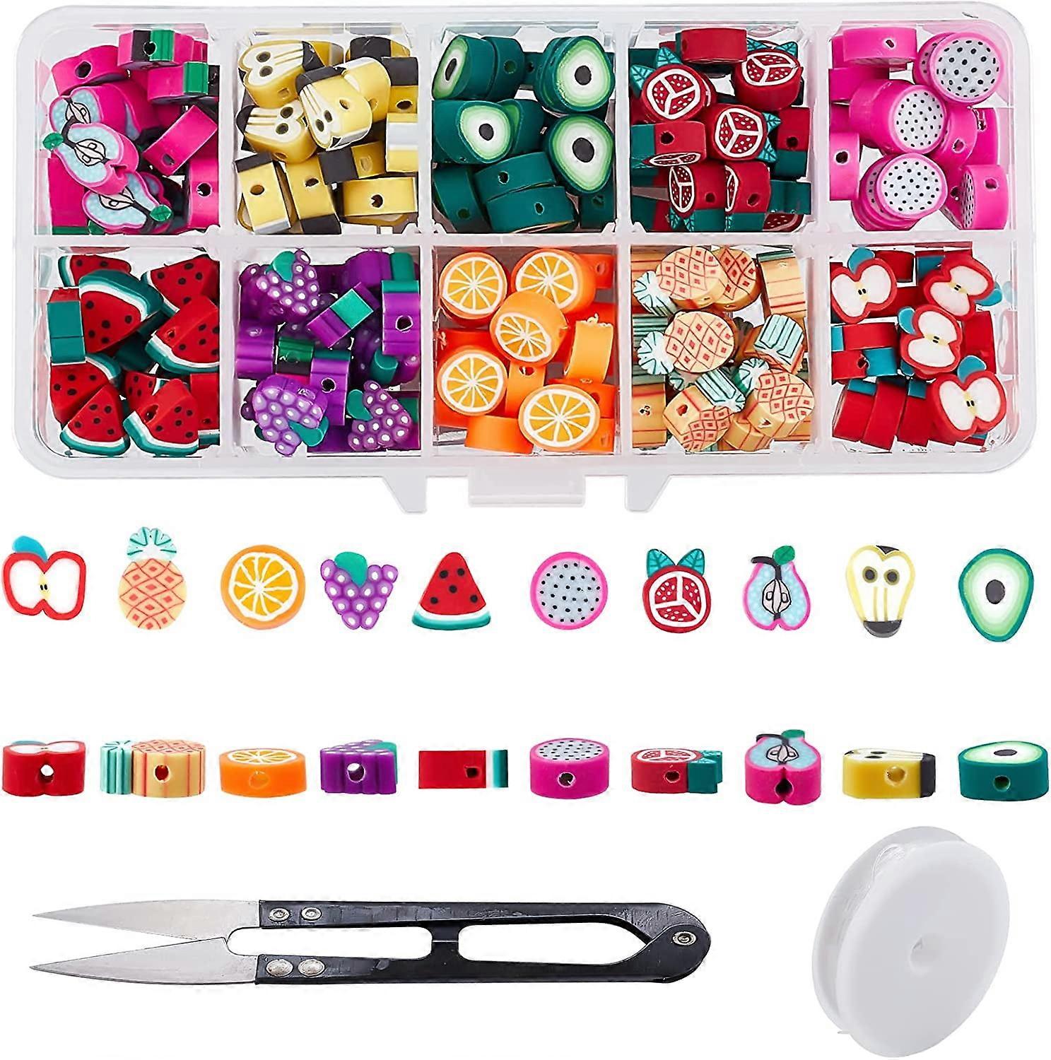 200Pcs 10 Style Handmade Fruit Polymer Clay Beads with Smile Face, Loose Beads + 1 Roll Crystal Thread & Scissors for DIY Jewelry Making