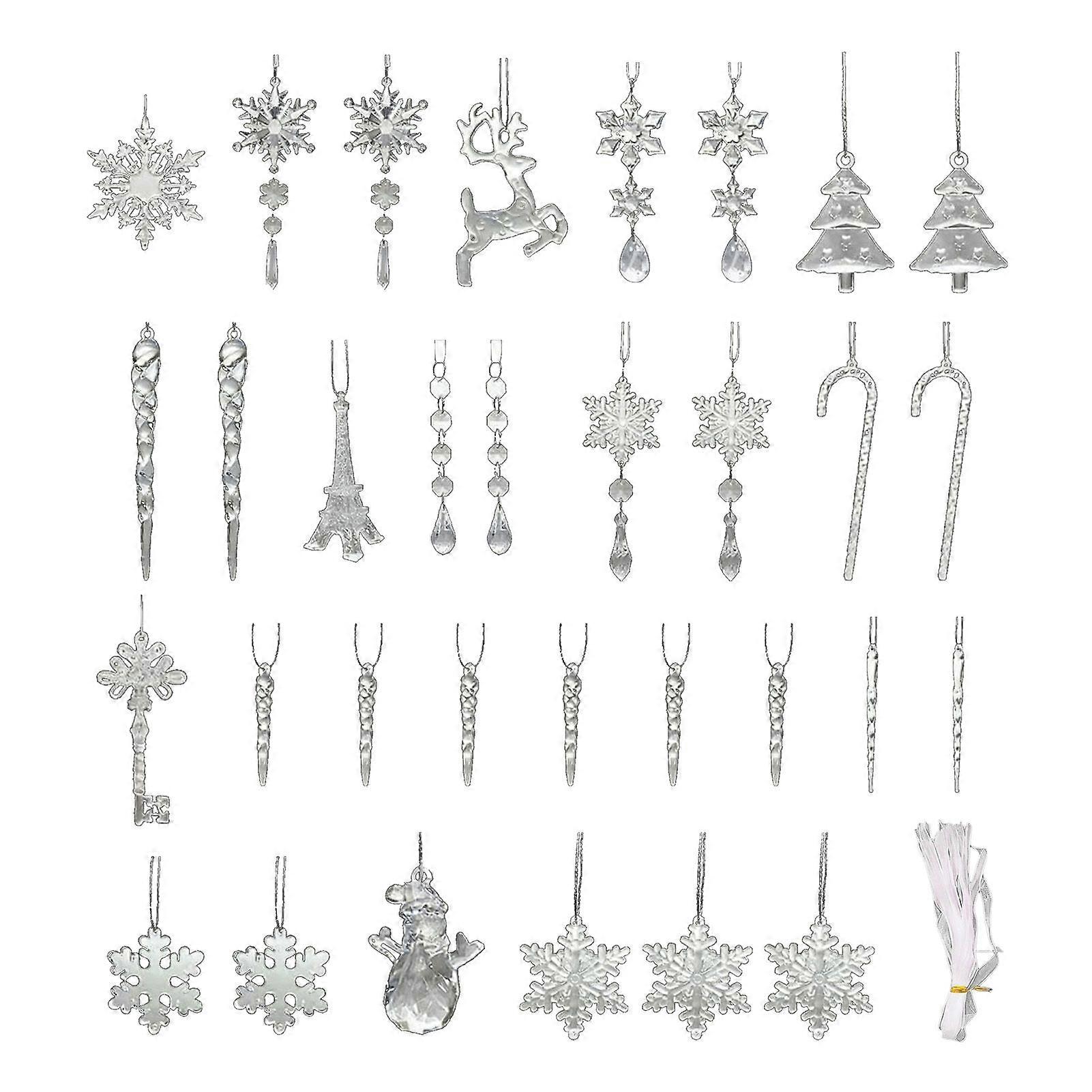 Kaesi 32 Pcs Christmas Ornaments Acrylic Hanging Decor Set with Snowflakes Deer Snowman Icicles Candy Canes Eiffel Tower Xmas Tree Decorations