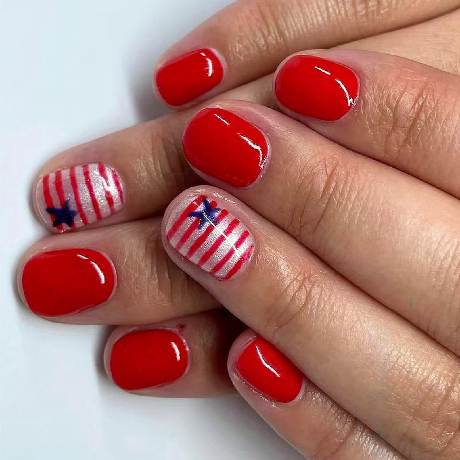 24 Pcs Independence Day False Nail Star Artificial Nail 4th of July Full Cover Stick on Nail Short Oval Press On Nail Multicolor