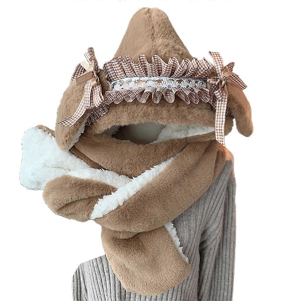 3-in-1 Function Rabbit Ear Plush Hat Lolita Hoodie Cap Scarf Gloves Combo Thicken for Winter Daily Wear Morning Workout Deep camel