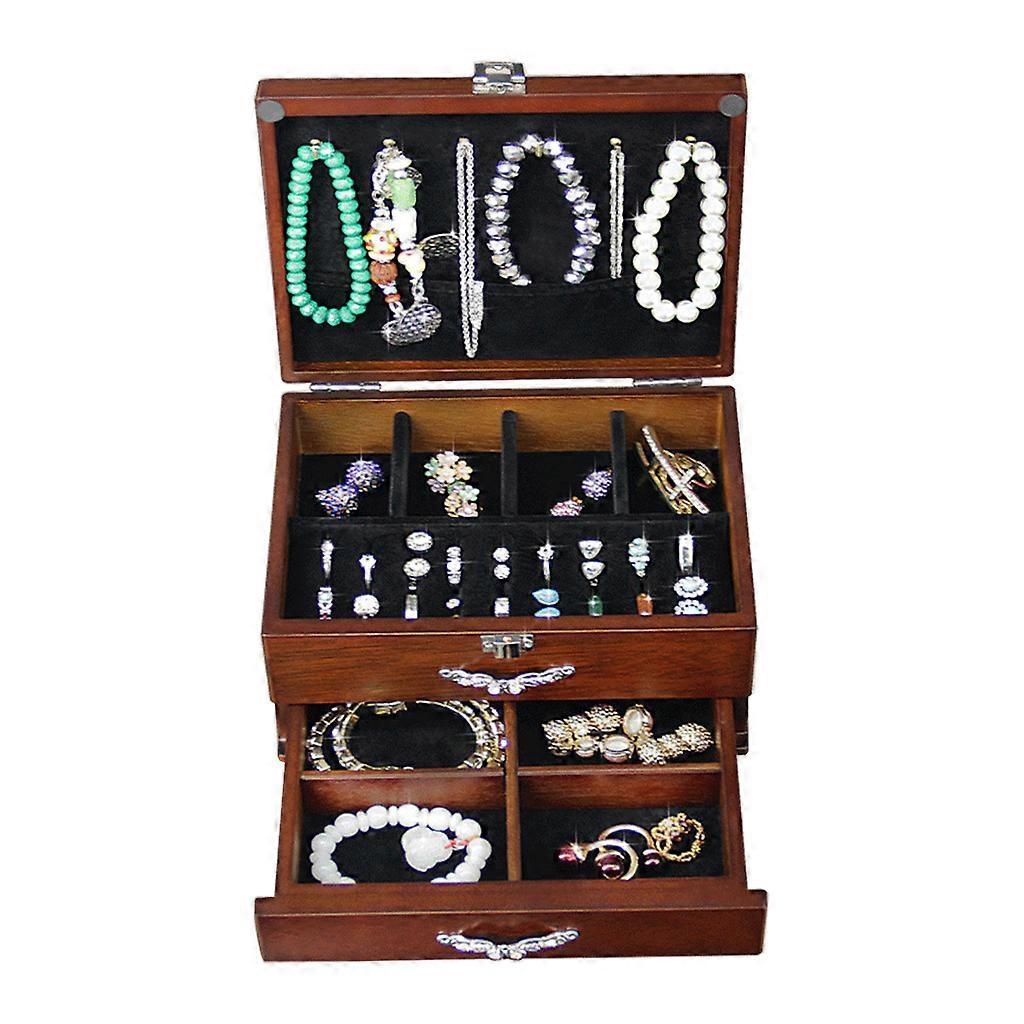 Jewelry Box with Lid Dust Proof Made by Wood Durable Strong 2 Colors to Choose 2 Tiers and Buckle Design Large Capacity Walnut