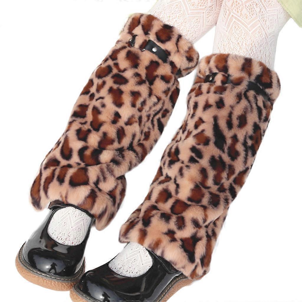 Women Winter Plush Leg Warmers Cover with Buckle Belt Lolita Knee High Socks Leopard