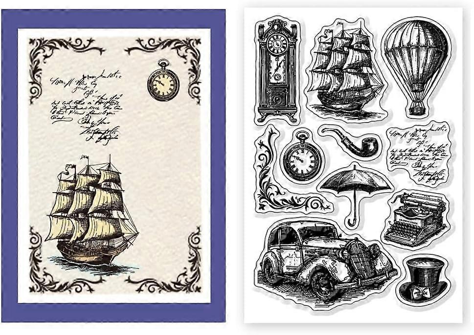 Vintage Clear Stamps Car Boat Wall Clock, Transparent Silicone Stamps for DIY Scrapbooking, Cards Making, Photo Journal, Compatible with Retro Art