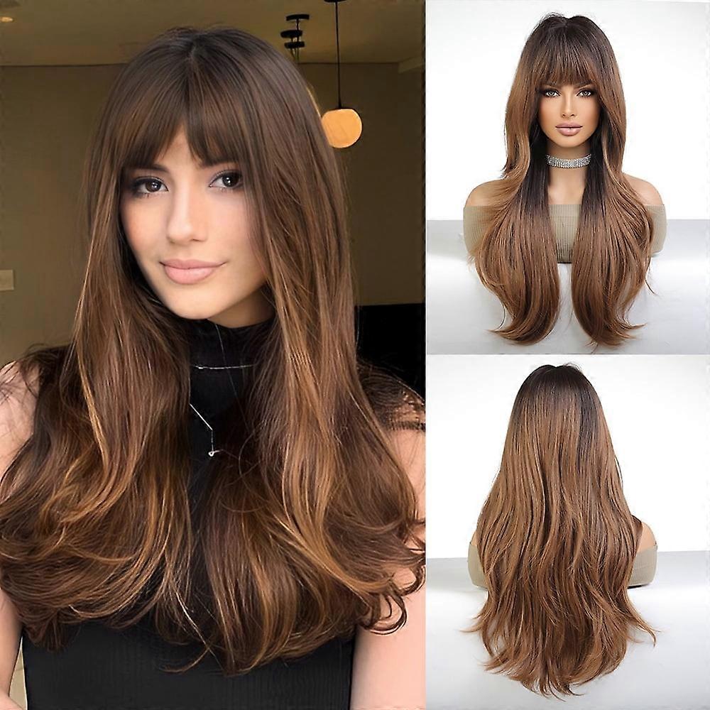 Long Wavy Butterfly Haircut Wig with Ombre Brown and Bangs - Heat Resistant Synthetic Wig for Daily and Party Wear