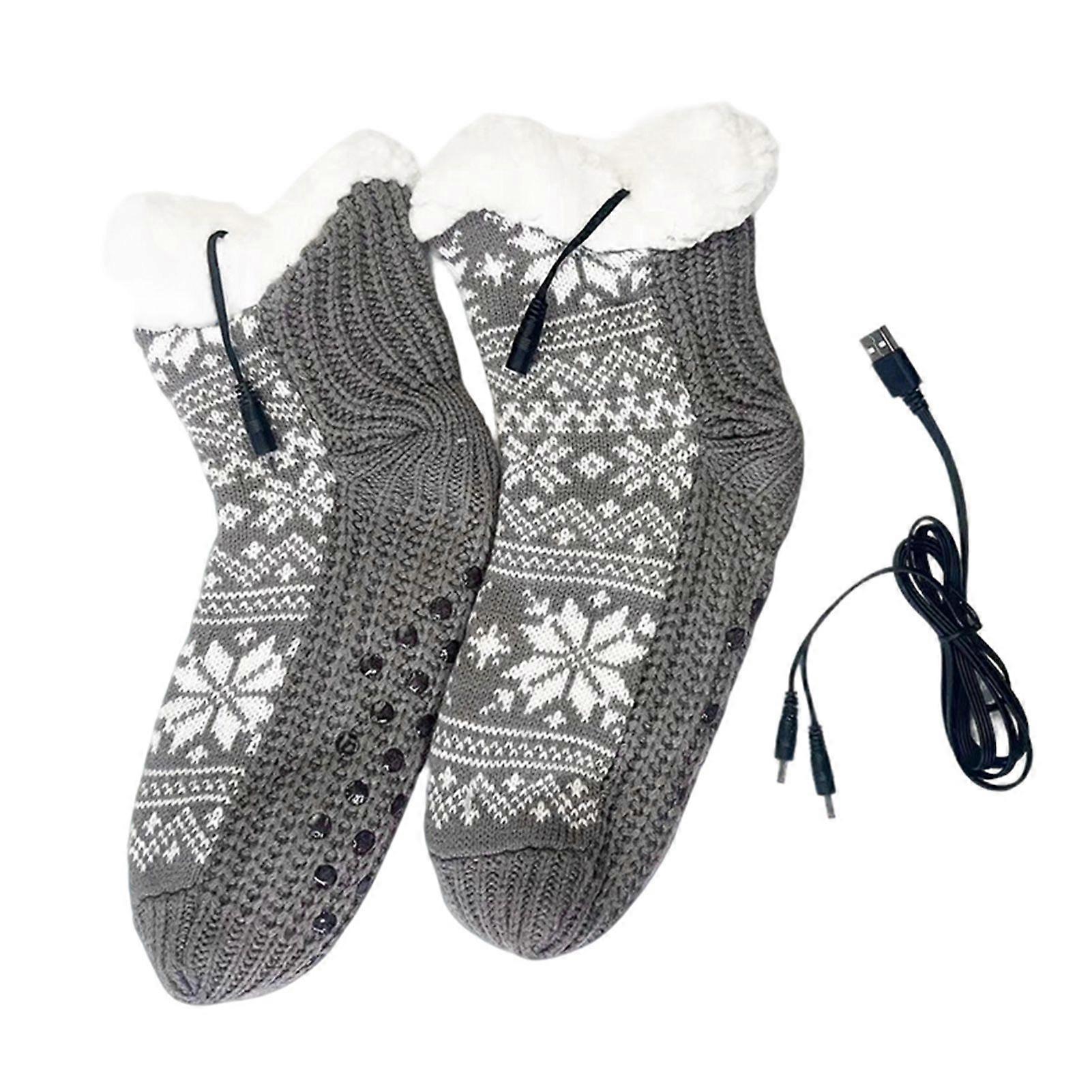Classic Snowflake Elegance: These heating socks feature a stylish snowflake pattern that adds a touch of sophistication to your winter wardrobe. The elegant design not only enhances your seasonal look but also brings a cozy, festive atmosphere to any outfit, making them perfect for both casual and formal occasions. Power Supply Friendly Design: Engineered for convenience, these heated socks are compatible with standard 5V USB power supplies or 5V 2A adapters. This ensures easy connectivity and reliable, consistent warmth during cold weather, allowing you to stay comfortable without hassle whether at home or outdoors. All-Day Warm Support: Crafted from super soft velvet and breathable cotton, these socks provide continuous warmth and comfort throughout the day. Ideal for outdoor activities like camping and fishing or indoor use in offices and homes, they help maintain optimal foot temperature in chilly environments. Rugged Moisture-Wick Technology: Incorporating advanced moisture-wicking materials, these socks effectively manage sweat and dampness while maintaining durability. This technology ensures your feet stay dry and warm under various conditions, enhancing comfort and extending the life of the socks. Unique Gift Option: Thoughtfully designed as a practical yet heartfelt gift, these heated socks offer warmth and care to friends and family during cold seasons. Their combination of functionality and stylish appearance make it an ideal gift choice. Item Name: Heating Socks Material: Super Soft Velvet Applicable Gender: Neutral/Both Men And Women Size: One Size Fits All (24-28cm) Input Voltage: Direct Current 5V Power Supply: USB Features: Non-Slip Grippers, Warm, Fast Heating Size Details: Suitable Foot Length: 24cm-28cm/9.45"-11.02" (Approx.) Notes: Due to the light and screen setting difference, the item's color may be slightly different from the pictures. Please allow slight dimension difference due to different manual measurement. Package Includes: 1 Pair of Heating Socks 1 x USB Cable