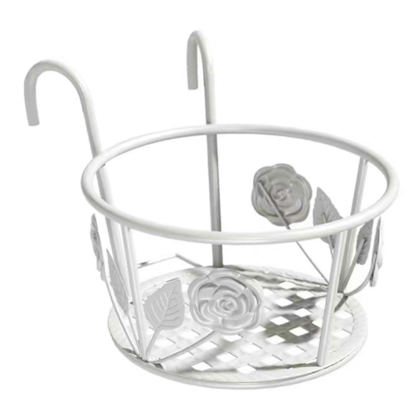 Wrought Iron Plant Rack with Hanging Flower Basket Hooks for Balcony Railing and Outdoor Decor (White)