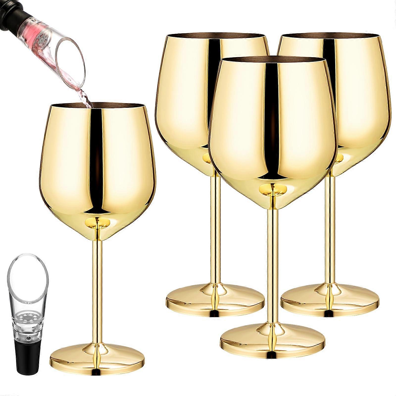Stainless Steel Wine Glass Set of 4 with Aerator Spout, Stemmed Unbreakable Goblets for Wedding Party Anniversary (Gold)