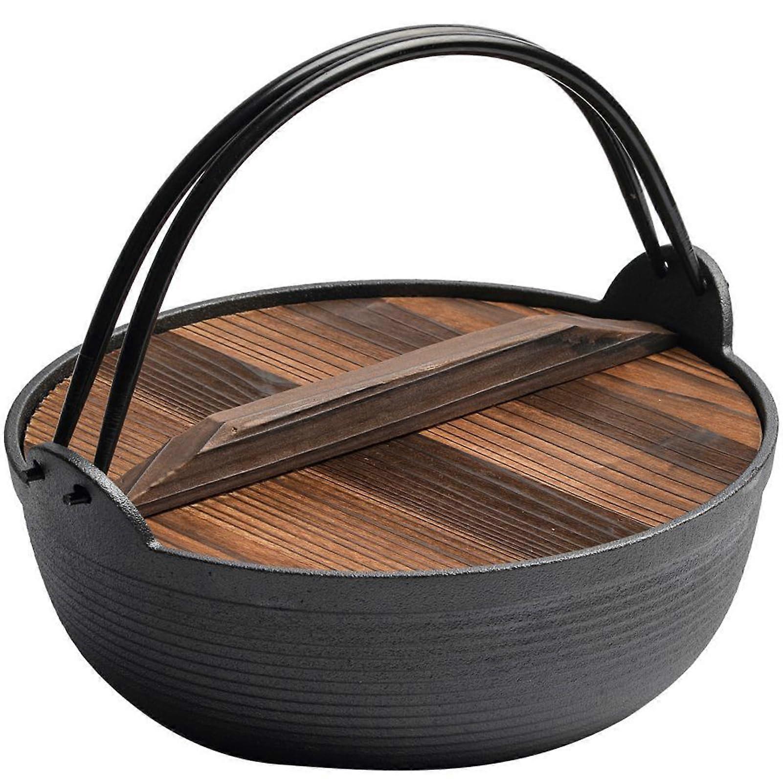 Cast Iron Sukiyaki Hot Pot 5L with Wooden Lid for Stew BBQ Camping Cooking