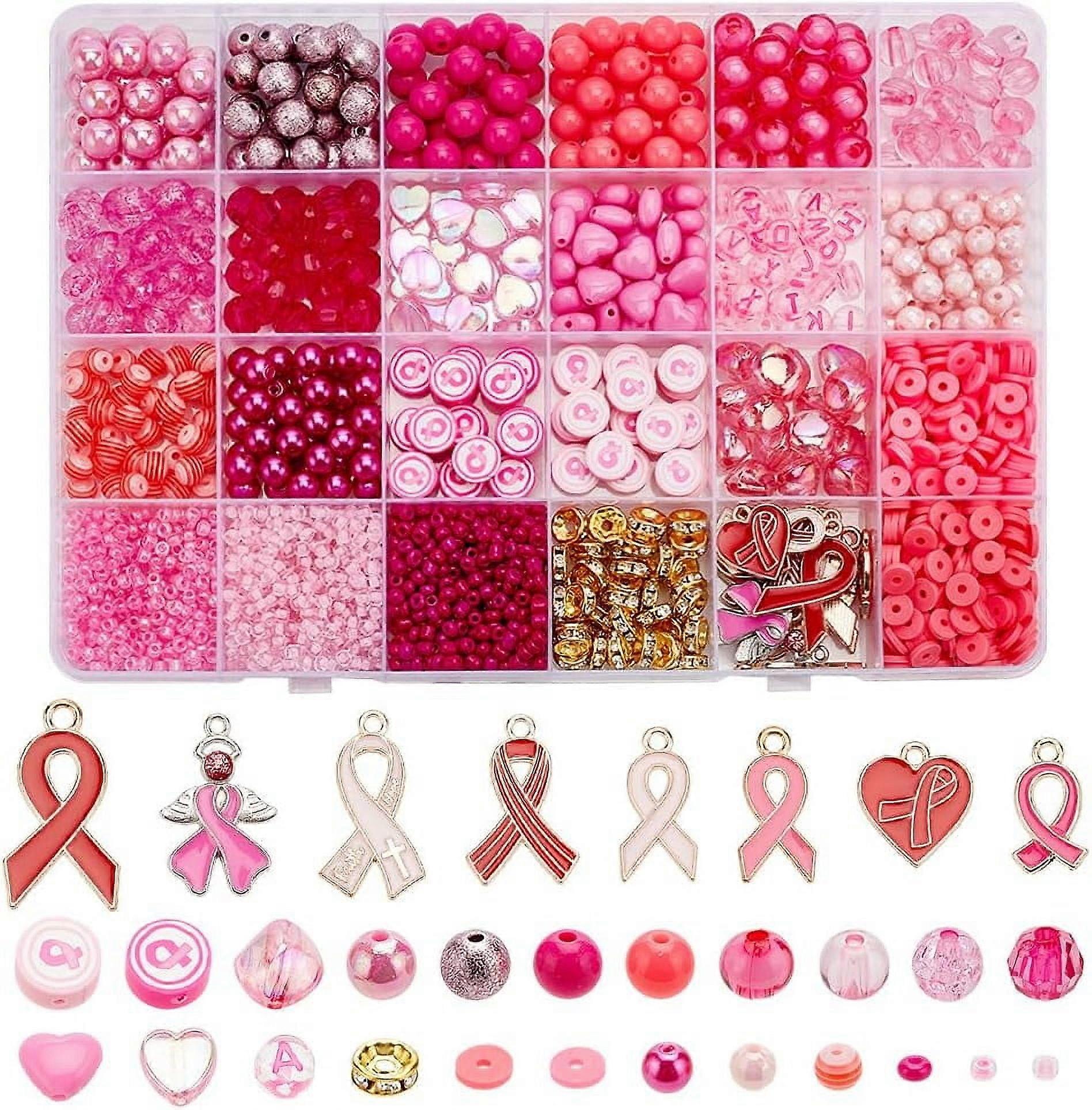 1761PCS Breast Cancer Awareness Charms Beads, Pink Ribbon Pendants, Acrylic Crystal Clay Loose Beads for Jewelry Making, compatible with women's