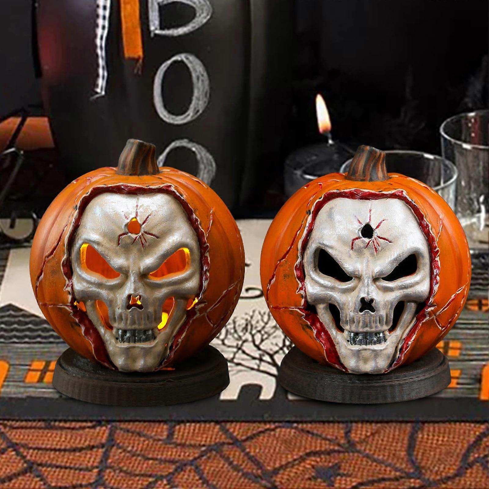 Halloween Light-up Skull Pumpkin Figurine, LED Skeleton Pumpkin Head Resin Statue for Home Office Desktop Decoration Party Ornament