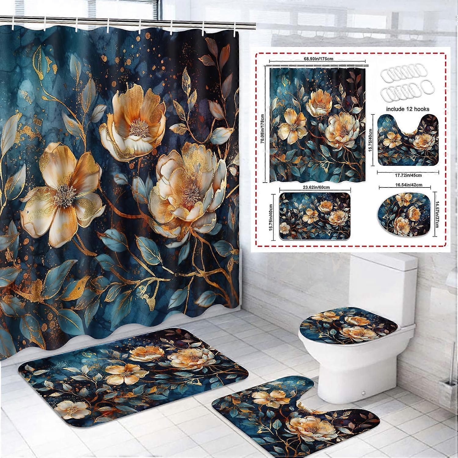 4 Pcs Polyester Bathroom Shower Curtain Sets with Bath Rugs, Gold Flower Pattern, Compatible with Standard Showers