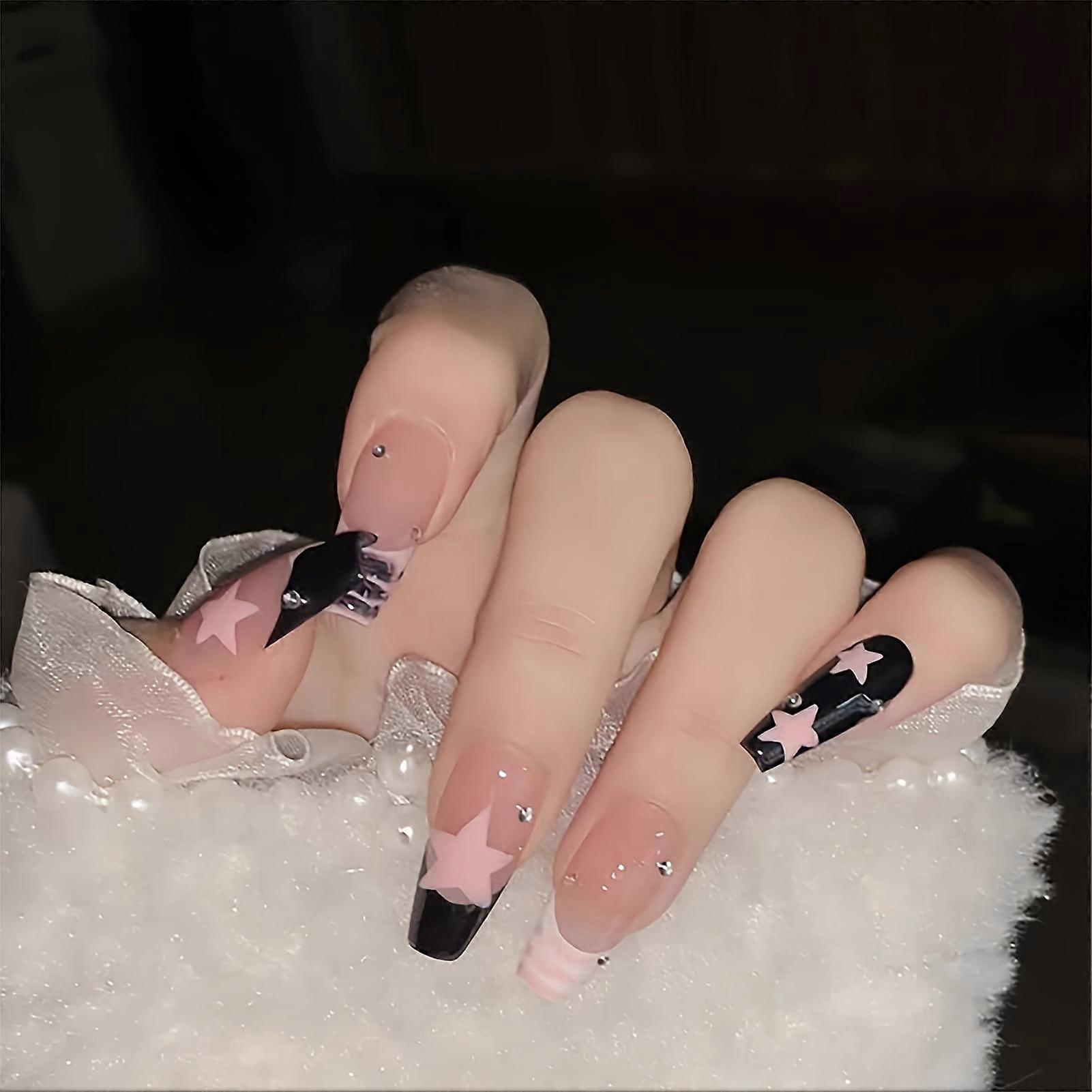 French Tip False Nails With Design Black Stick On Nails Acrylic Nails Pink Glossy Natural Nude Glue On Nails For Women Girls Manicure 24Pcs