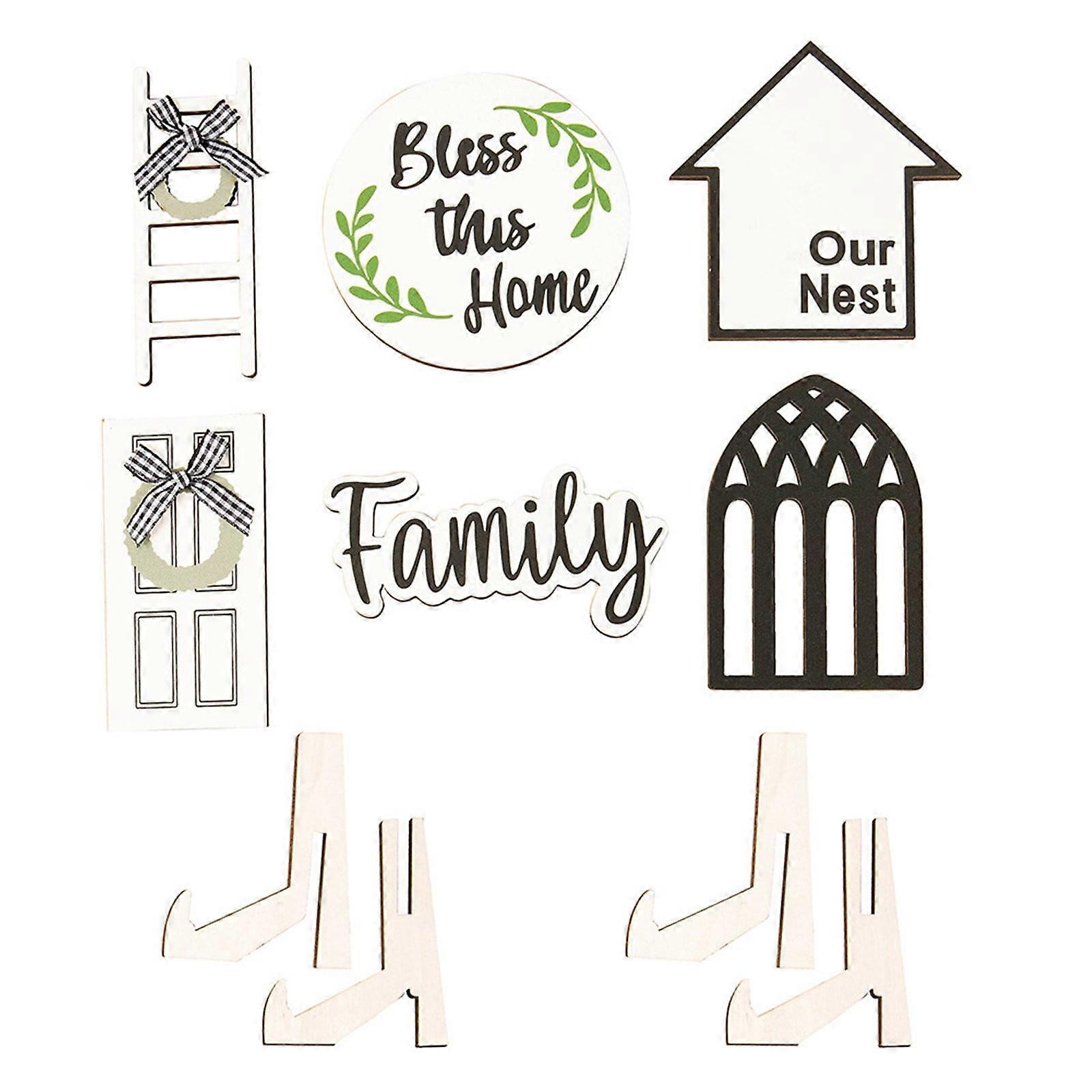 8-Pc Farmhouse Tiered Tray Decor Set w/ Rustic Wooden Sign, String Lights & Stands - Compatible with Kitchen Table Centerpieces, White
