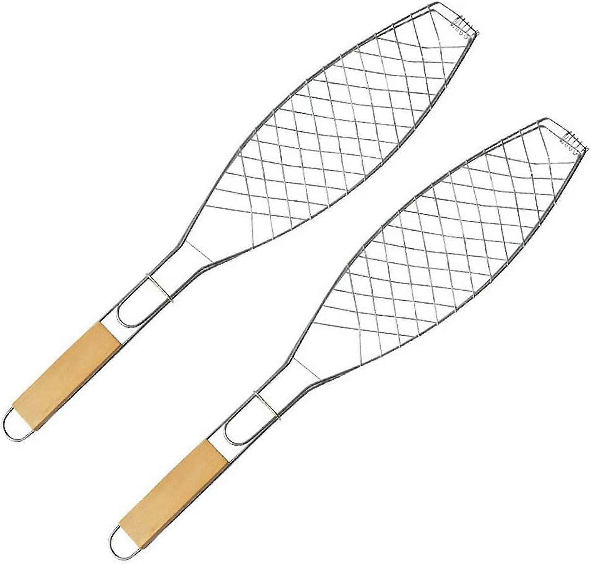 2 Pcs Fish Grill Basket, Stainless Steel with Wooden Handle, Portable BBQ Tool for Roasting Fish, Vegetables, Shrimps