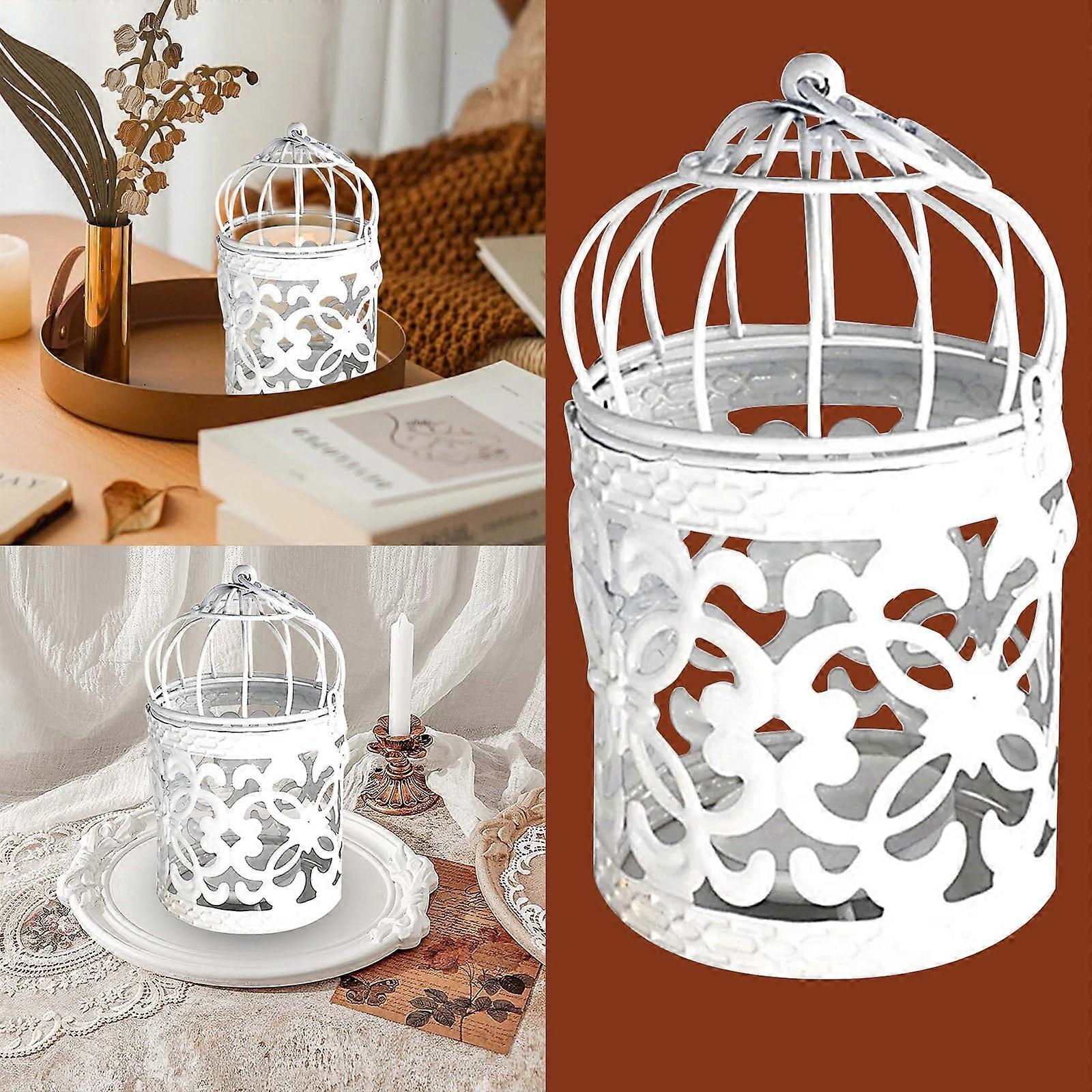 Yakbaofuo Hanging Hollow Candlestick, Compatible with Tealight Holders, Vintage Bird Cage Metal Decor for Home, Wedding, Party - White
