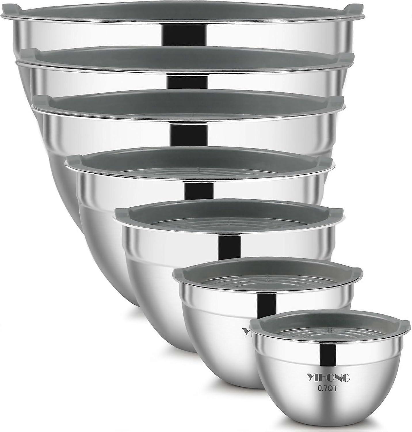 Product Description: Multi-use Stainless Steel Mixing Bowls Make Your Cook More Easier: 1. Our stainless steel mixing bowls have all the sizes you need for cooking, baking and more, set includes 4.5 , 3.6 , 2.7, 2.1 , 1.7 ,1.1 , 0.7quart, great to use for serving bowls to serve fruits, salad bowls, ingredient, cereal bowls, cookie bowls,and much more. 2. Product Features: Dishwasher safe for the bowls. Hand wash the lids, these lids are NOT dishwasher safe, please do not place in dishwasher. 3. Washing Instructions: Dishwasher safe for the bowls. Hand wash the lids, these lids are NOT dishwasher safe, please do not place in dishwasher. Satisfy Your Various Needs: High Quality and Food Safe with YIHONG mixing bowls: Freezer Safe: Great for storing food in the refrigerator. Dishwash Safe (Not the Lids): Can be put in the dishwasher, free your hands.(hand wash the lids) Nesting Design: These bowls are easily nests inside each, save space and easy to store. Airtight Lids: BPA free plastic lids closely fit the bowls, keep your food fresh for longer. Make Your Cooking Much Easier — Multi-purpose, stainless steel mixing bowl is essential to your everyday kitchen needs,7 different sizes of 4.5, 3.6, 2.7, 2.1, 1.7, 1.1, 0.7Qt will complement your cooking and make cooking much easier. Ideal for making a quick salad, preparing food, mixing batters, or storing and serving food. Multi-use to Meet You Needs — These metal bowls are perfect for everyday use on your home table, they are ideal for serving or even as storage bowls, or ingredient bowls. Nesting and Stackable — Easily nest in each other, so you can save space on the countertop, also they can easy storage stack on top of each other, keep them in a spot in the corner of your kitchen, and easily access your food items. Durable and High Quality — Made of high-quality stainless steel for lasting use, which is resistant and rustproof. These mixing bowls are dishwasher safe, more convenient for you and your family. Plastic Lids Included — Each of these bowls features a white cover that helps easily identify contents, these lids seal on the bowls tightly, so you can store food in the fridge or take it on.