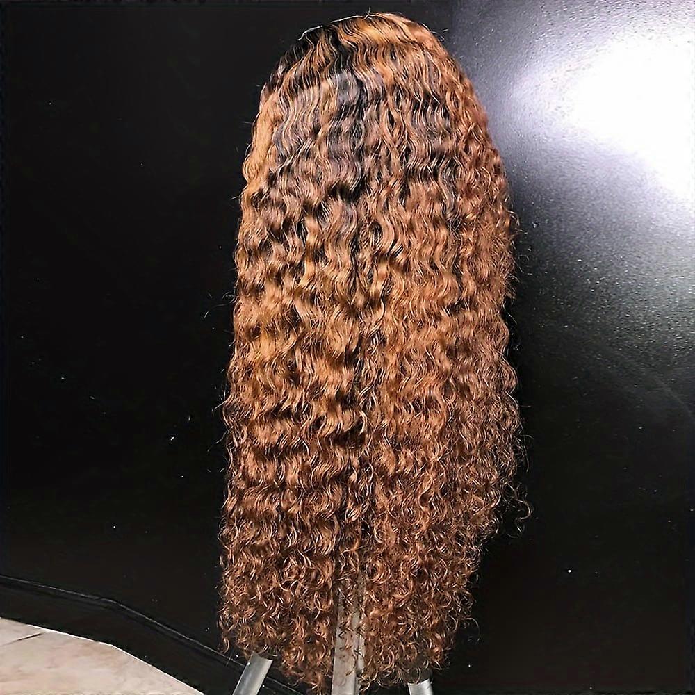 13x4 Deep Wave Lace Front Wig, Ombre Auburn Brown with Black Roots, 24" Glueless Pre-plucked Synthetic Water Wave Wig for Daily Use