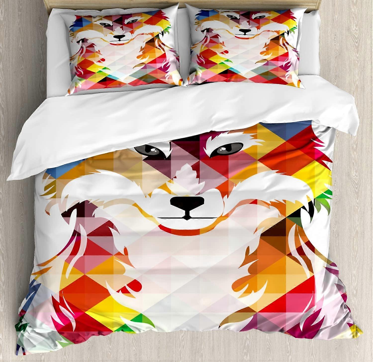 Modern Duvet Cover, Abstract Fractal Fox Colorful Geometric Pattern, 3 Pcs Set with 2 Pillowcases, Blue Red