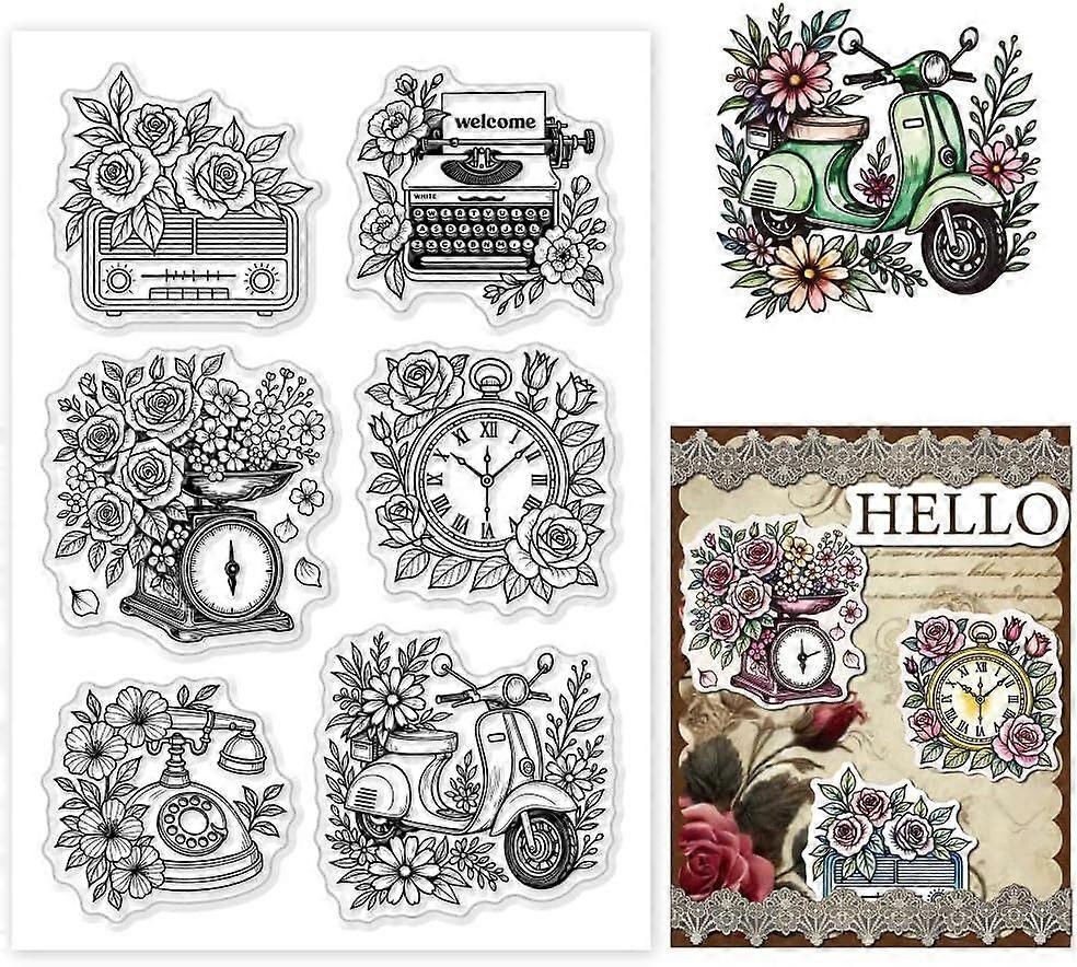 1 Sheet Clear Stamp Vintage Motorcycle Floral Transparent Rubber Stamps Reusable Silicone Clear Stamp Seals for Card Making Scrapbooking Embossing Alb