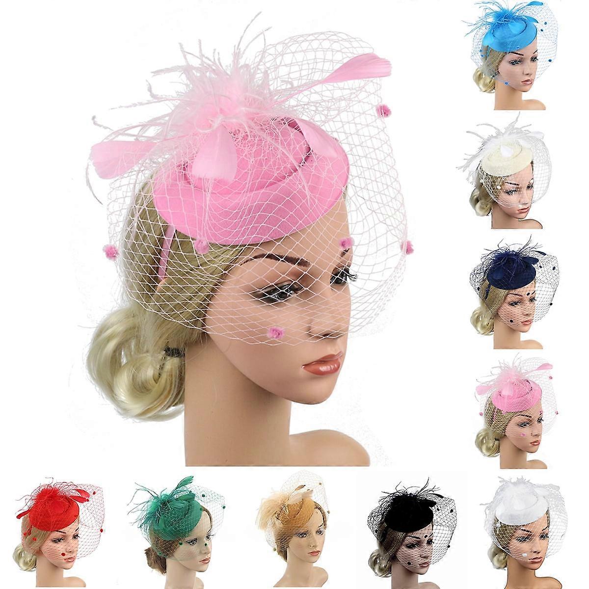 Fascinators Hat for Women Cocktail Tea Party Headwear Mesh Ribbon Feathers Headband-Pink