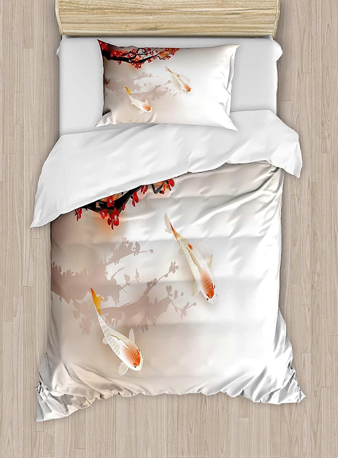 Koi Fish Duvet Cover Set, Sakura Branch & Leaves, 3-Piece Bedding with 2 Pillowcases, Black Peach