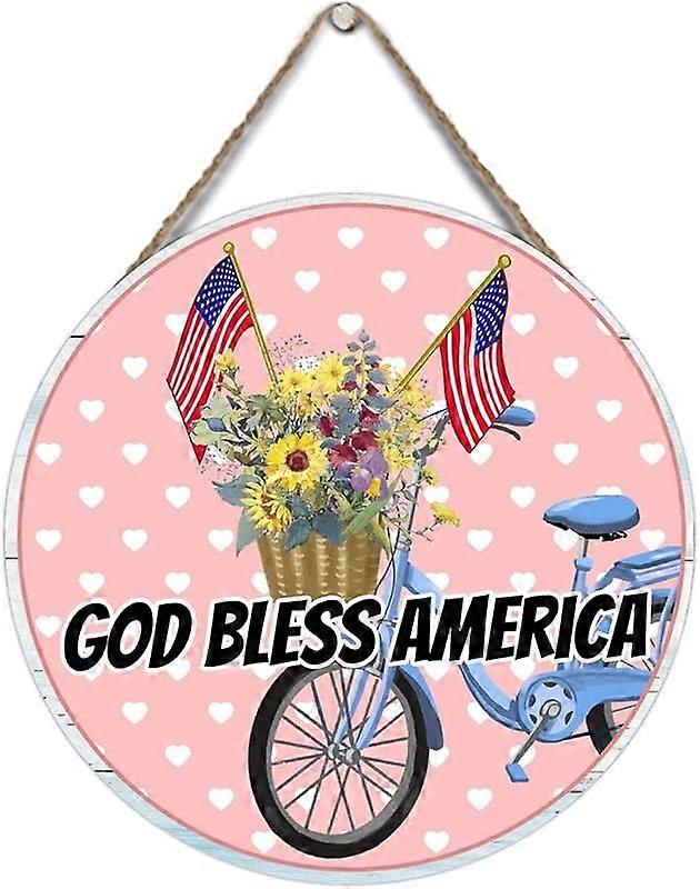 4th of July American Patriotic Wooden Signs 12x12in Round USA Flag Decor, God Bless America Rustic Wall Art Plaque