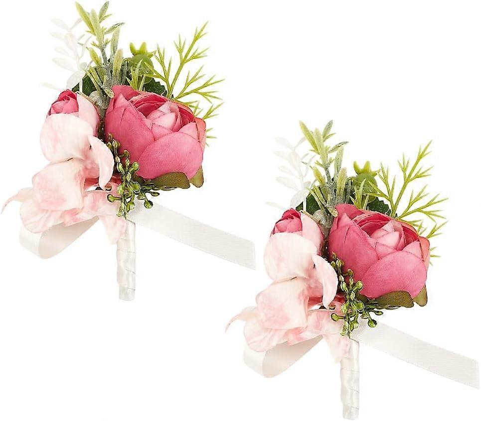 2Pcs Pink Rose Corsage Set with Green Leaves, Silk Flower Boutonniere Brooches & Ribbon for Bridesmaids, Groomsmen, Wedding, Prom