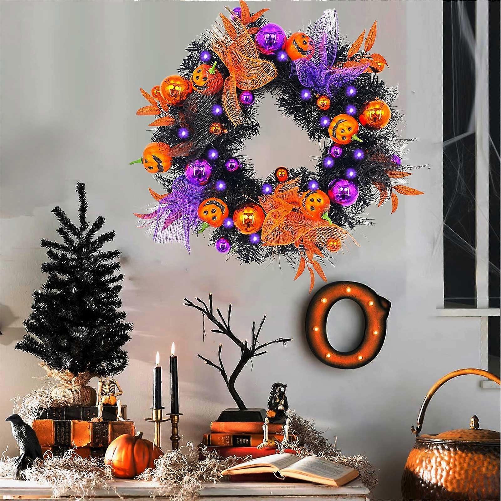 YiFudd Black Halloween Wreath for Front Door, Pre-lit Artificial Decoration for Indoor Outdoor Home Party, with Light