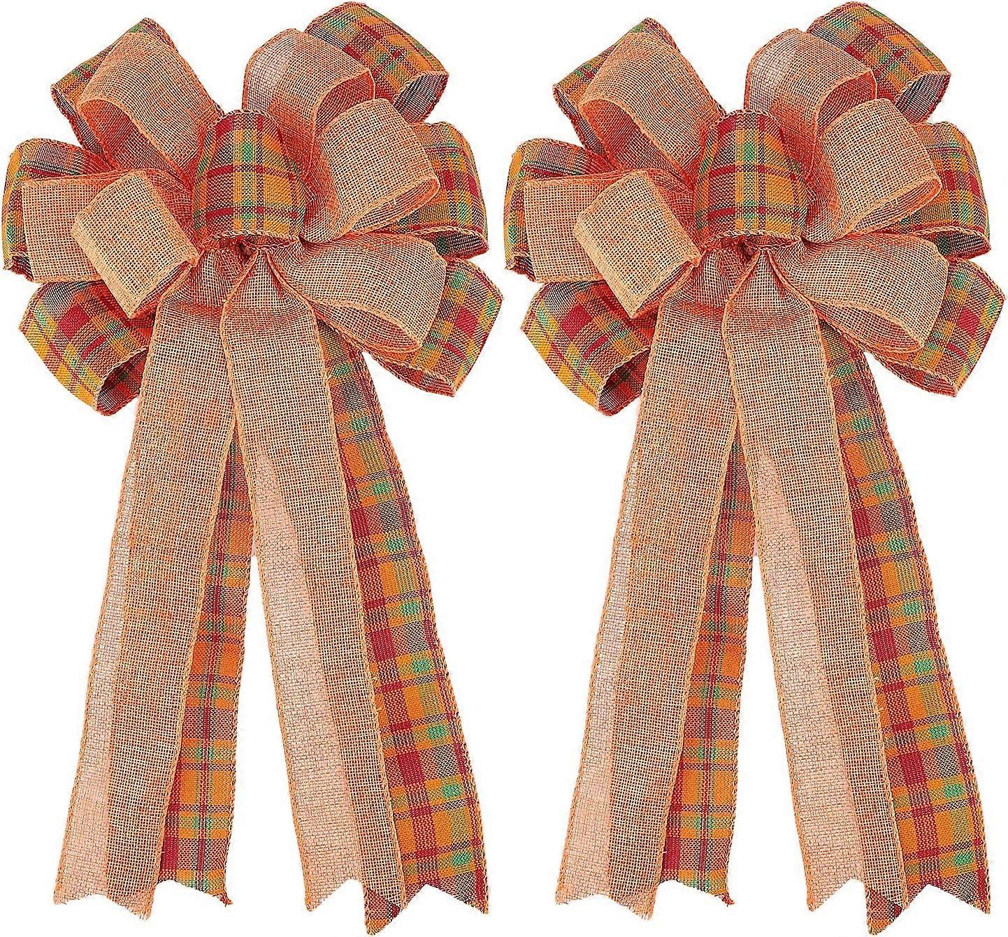 2Pcs 19x12" Orange Green Plaid Bow, Double Layer Polyester, for Thanksgiving Christmas Wreath, Tree Topper, Indoor Outdoor Decor