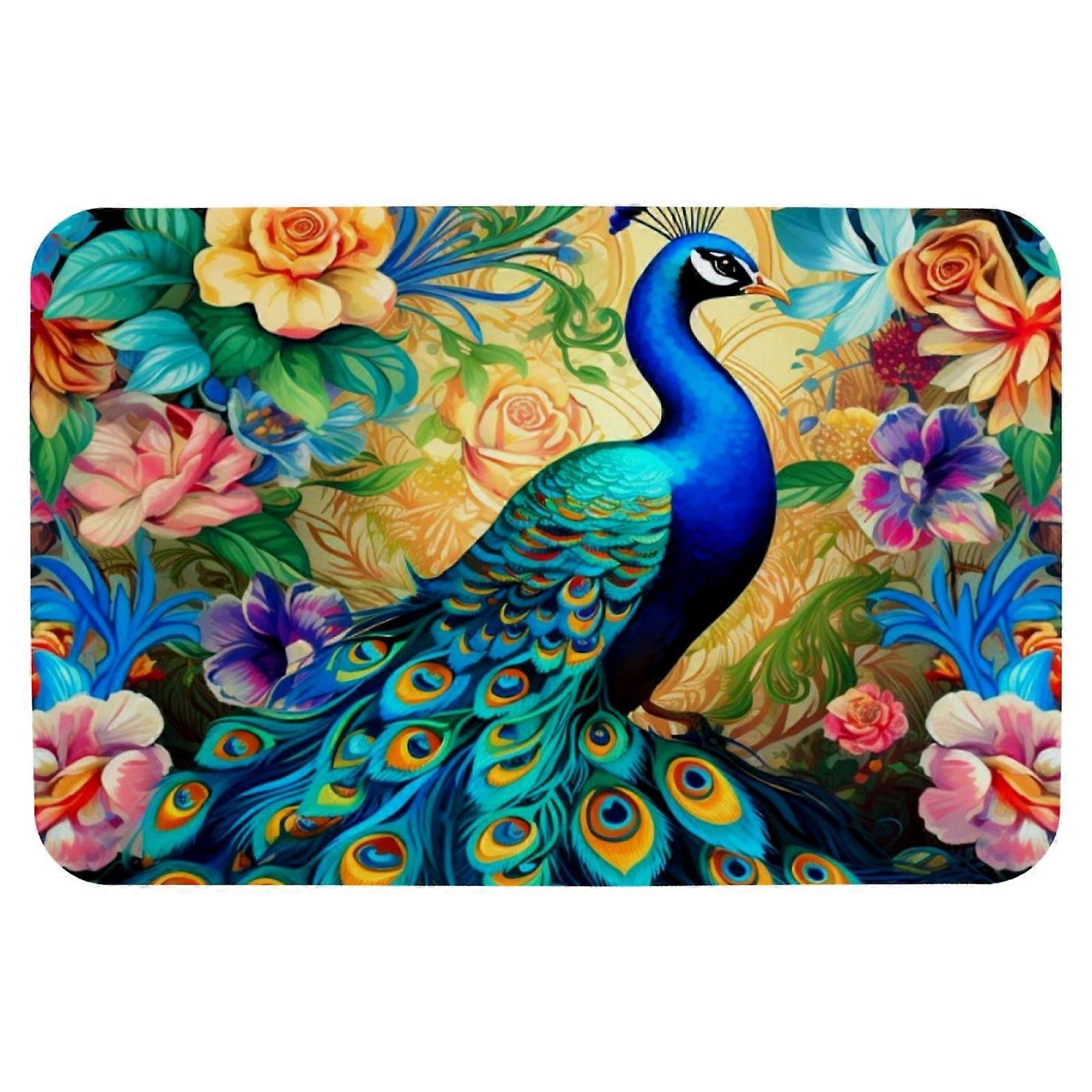 16x24in Peacock Flower Memory Foam Bath Mat, Soft Non-Slip Quick Dry & Super Absorbent, Machine Washable - Compatible with Bathroom Floors