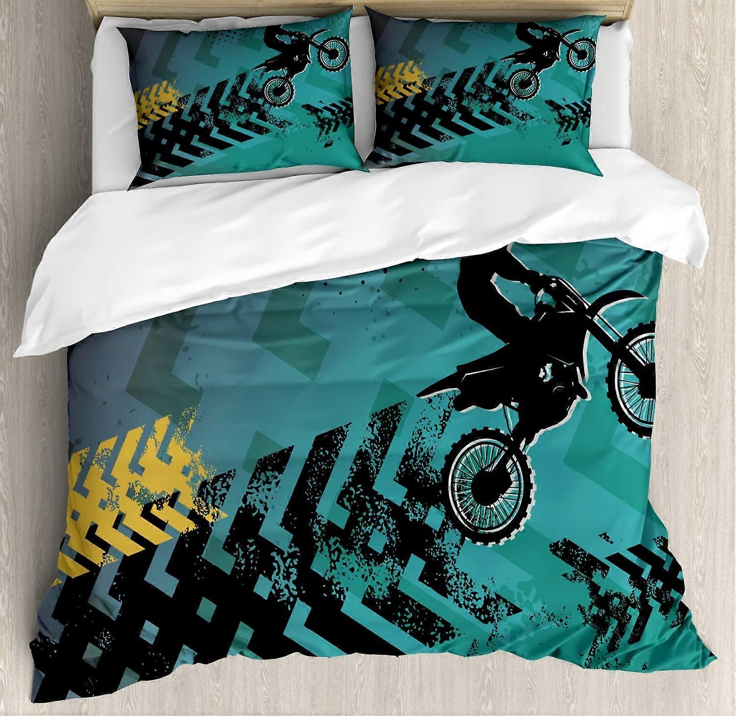 Dirt Bike Duvet Cover Set, Extreme Sports Theme with Stunt Racer Silhouette & Arrows, 1 Duvet Cover + 2 Pillowcases, Teal Pale Blue Black