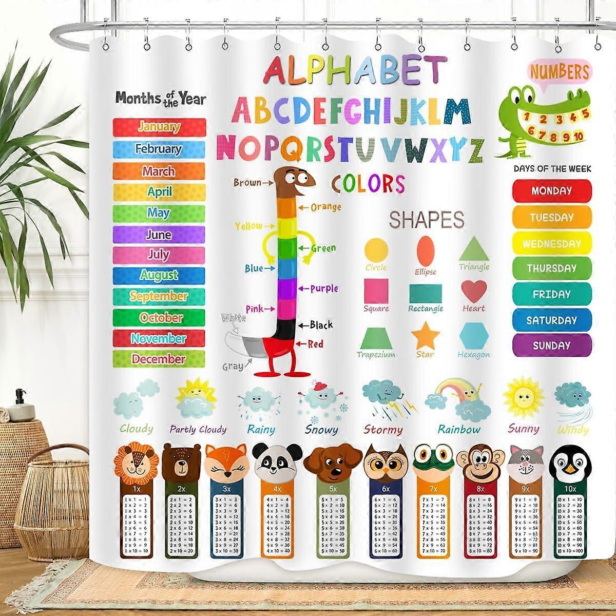 ABC Educational Shower Curtain with Hooks, Waterproof, 72"x72", compatible with standard tubs, Kids Learning Cartoon Animals, Colors, Shapes,