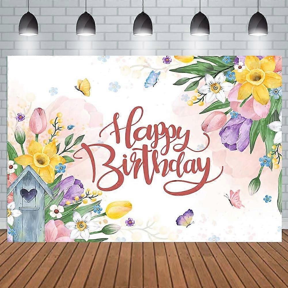 7x5ft Happy Birthday Backdrop - Colorful Watercolor Floral Garden with Butterfly & Tulip, Party Photo Booth Banner for Girls Women