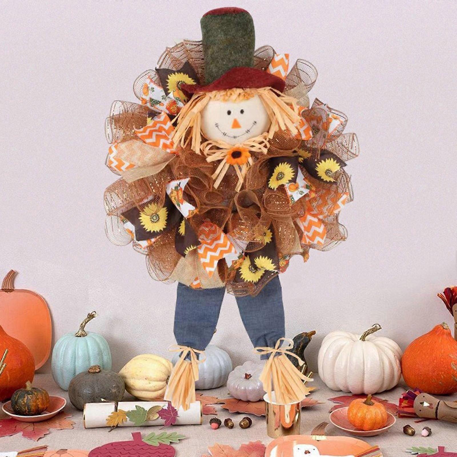 Halloween Black Wreaths for Front Door, Outdoor Fall Thanksgiving Farm Harvest Decoration, Simulation Scarecrow Wreath Wall Hanging