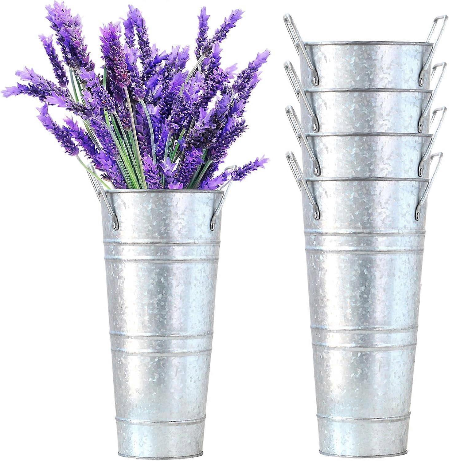 Galvanized Flower Bucket Stand, 9" Silver Metal Vase with Handle, Compatible with Umbrella Holder, Rustic Floral Decor for Home & Wedding, 4 PC