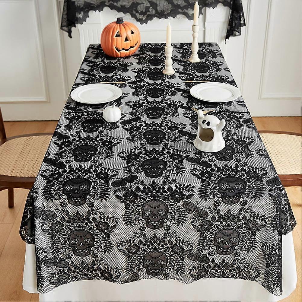 Black Skull Lace Halloween Tablecloth, Spooky Ghost Bat Spider Web Design, Oblong 100*220cm for Halloween Party Decor