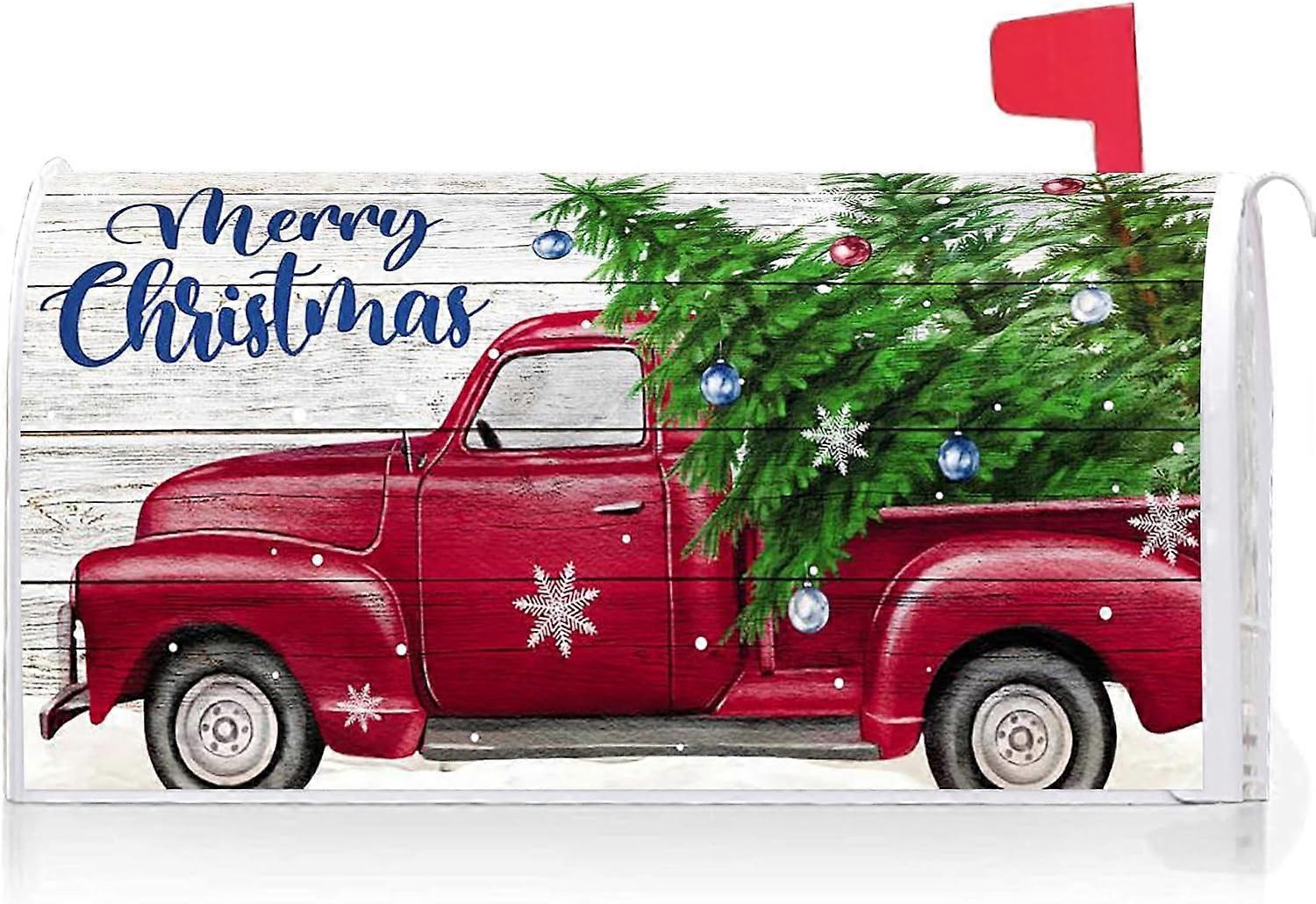 Merry Christmas Red Truck Pine Tree Mailbox Cover with Magnetic Strip, 21" X 18", Compatible with Standard Outdoor Mailboxes