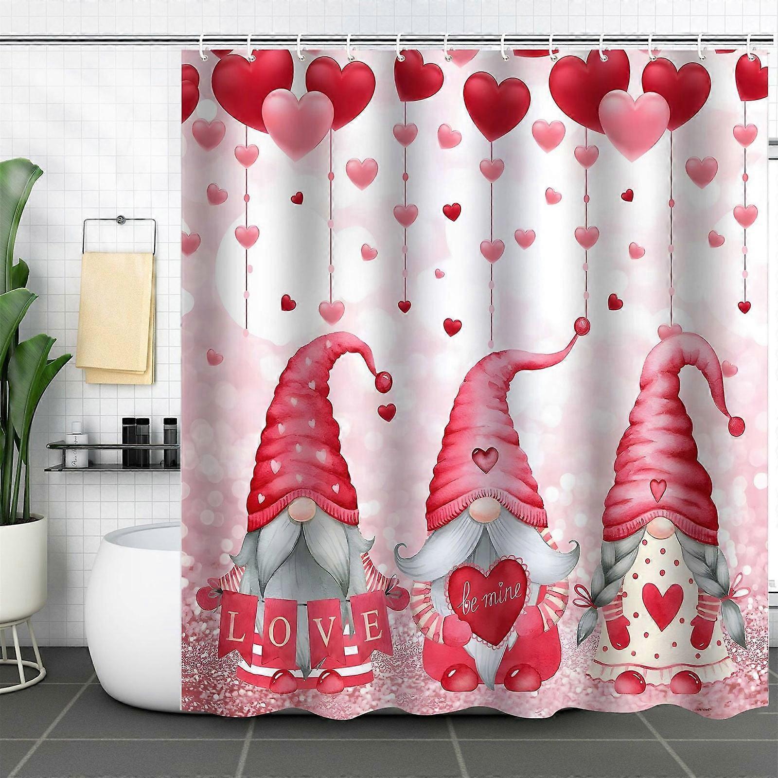 Cute Valentine's Day Shower Curtain with Red Love-Hearted Gnomes, Farmhouse Plank Design, Fabric Bathroom Shower Curtain