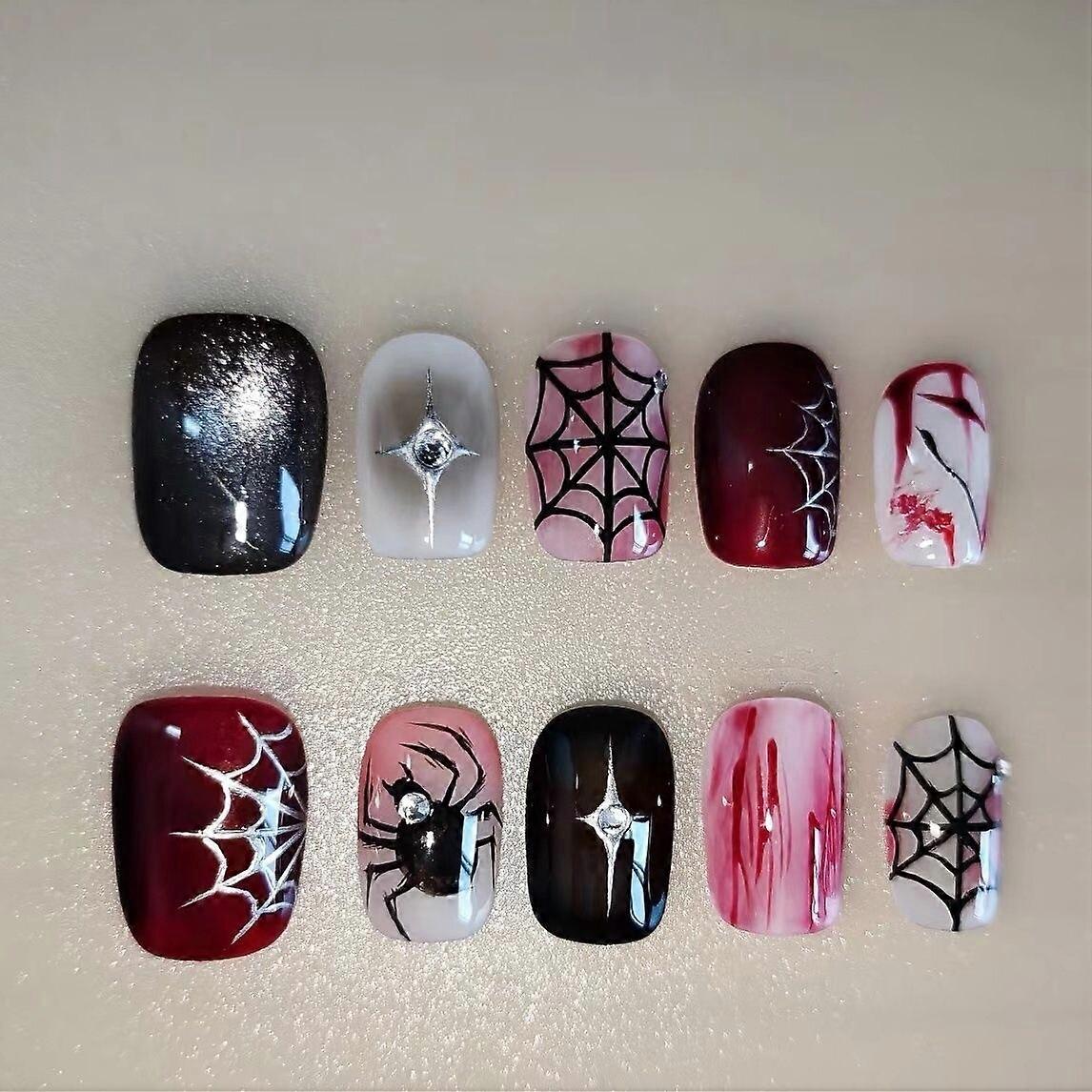 Handmade Halloween Spiderweb False Nail Short Coffin Press on Nail Nail Art