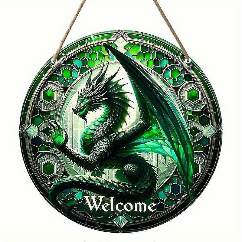 Round Wooden Hanging Sign, Green Dragon Welcome Plaque, Indoor & Outdoor Rustic Wall Art for Door, Porch, Living Room Decor