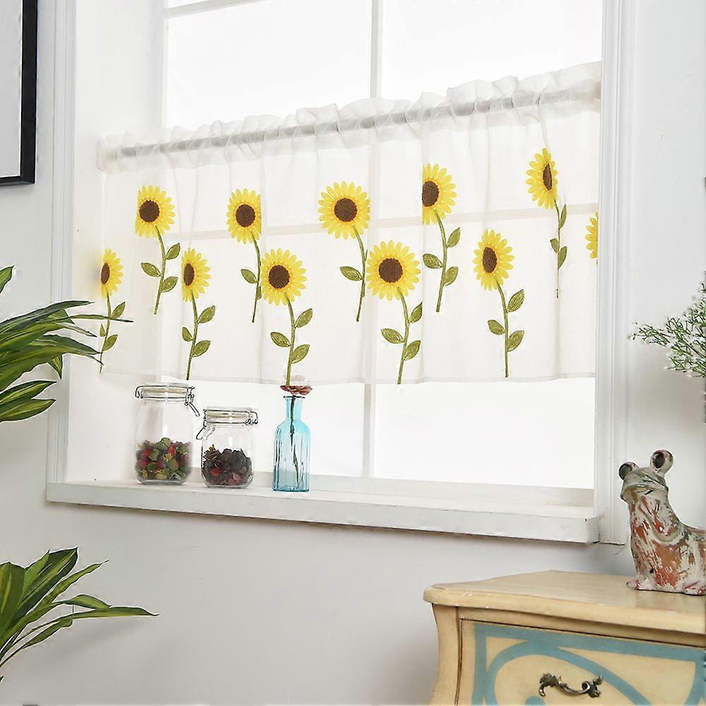 Semi Sheer Valance Curtains with Sunflower Embroidery, 40x19 Inch, for Small Window, Rod Pocket Kitchen Cafe Curtain (One Panel)