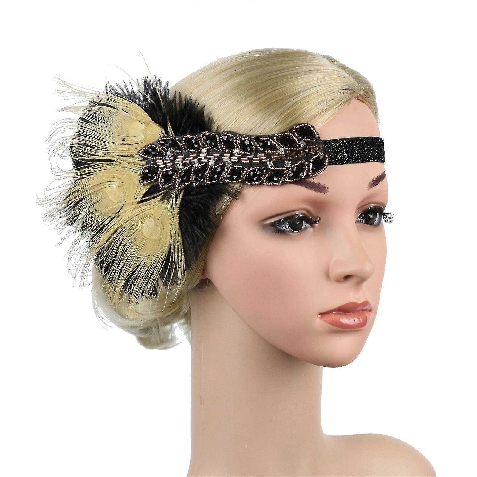 Bohemia Style Hairband with Feather&Color Rhinestone Decors Ethnic Elastic Headband for Girls Festival Halloween Party Multicolor