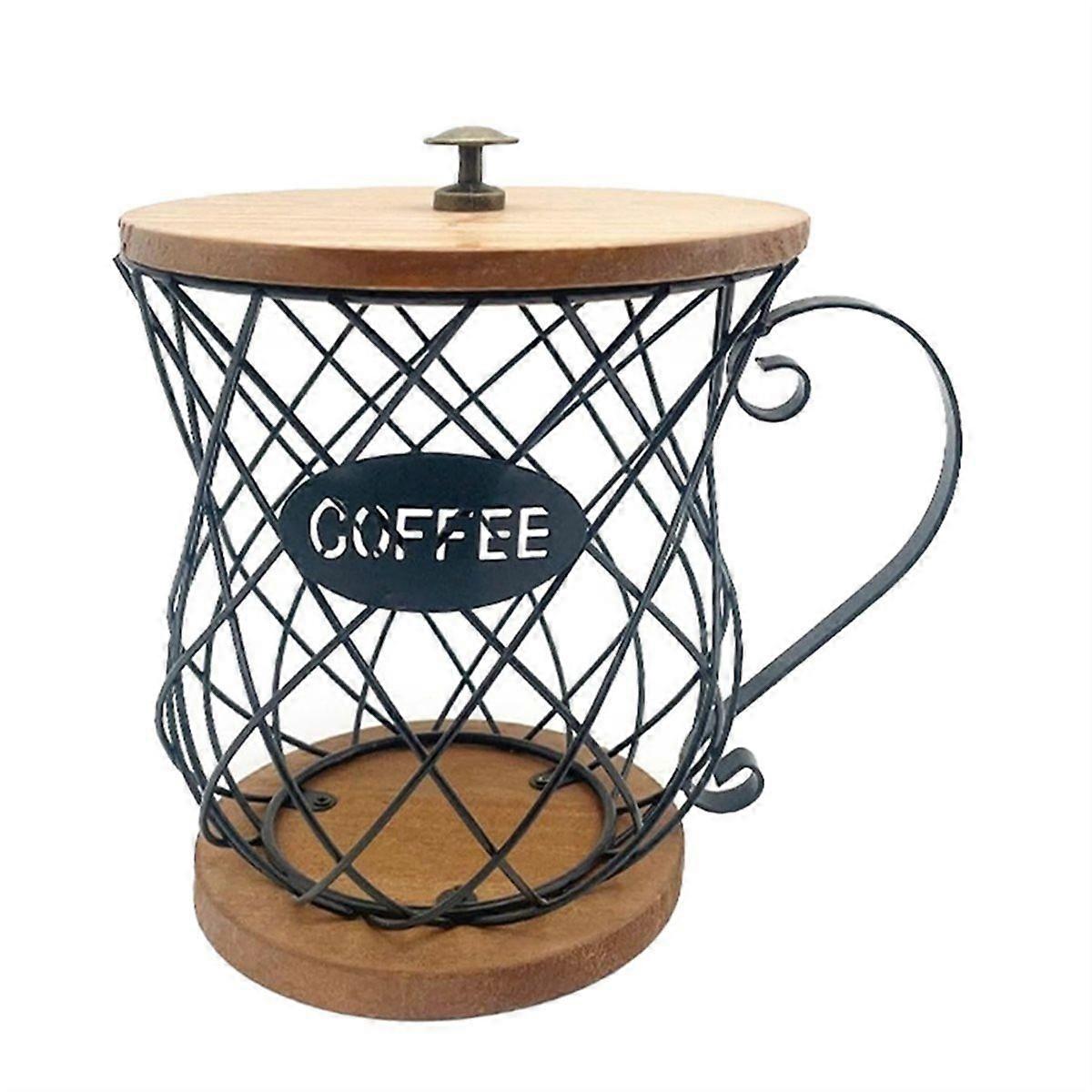 Metal Coffee Pod Holder Mug - Large Wire Basket with Wooden Base for Countertop Coffee Storage for H