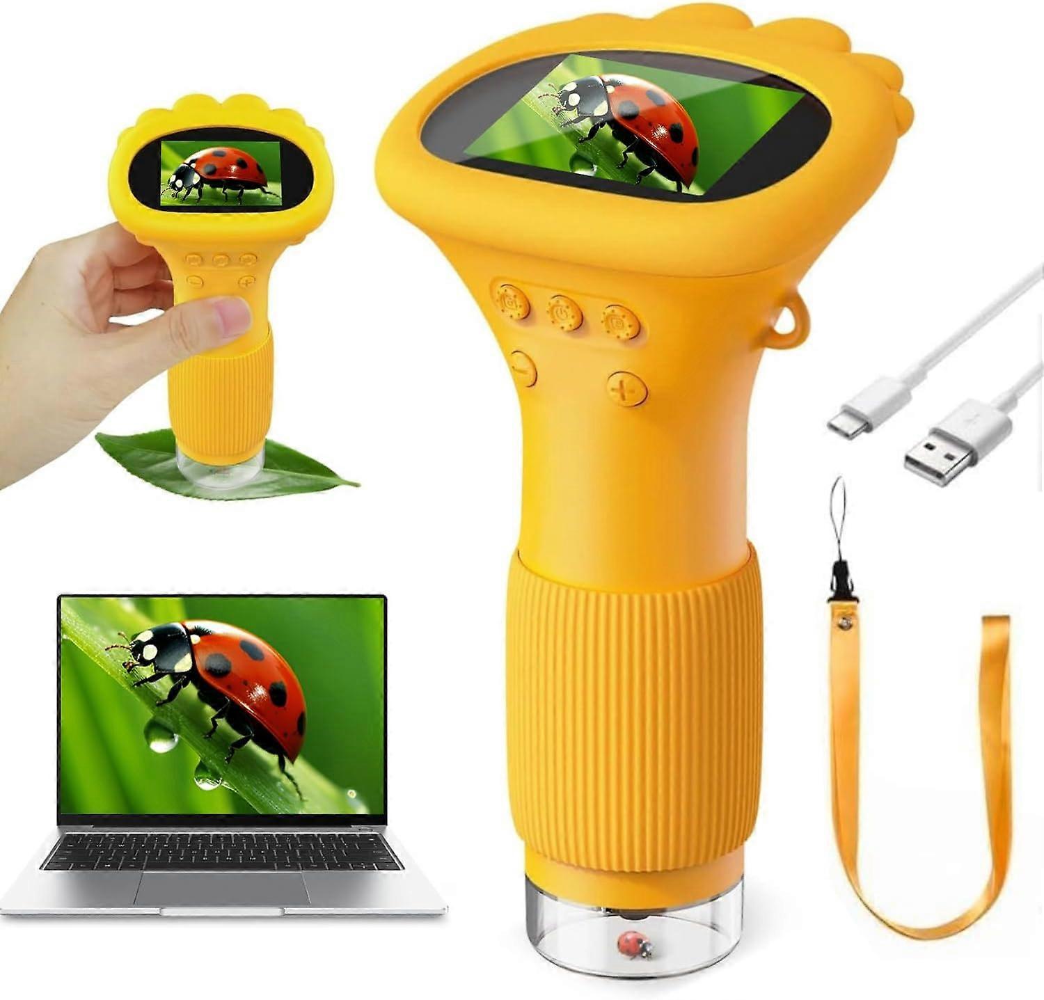 【High Resolution Display Screen】2" HD screen impresses with vibrant, rich colors and provides a stunningly clear and detailed display. It makes exploring the microscopic world easy and provides an even more intense and intuitive observation experience.<br>More than just a children's microscope: this microscope can take photos and videos and store up to 400 images. It is a practical tool to document and record the life cycle of plants. Ideal for adults, students and young explorers, it promotes interaction between parents and children as well as teachers and students.<br>THE PERFECT GIFT Imagine a child's radiant smile when they unpack this microscope for their birthday or Christmas! It is specially designed for curious minds aged 3 to 8 years and combines playful learning with fun. This microscope awakens a passion for science and discovery and is guaranteed to become one of the little ones' favourite gifts.<br>Microscope for Kids: The lemoni microscope comes with a removable screen decoration kit and a convenient 50 cm hanging rope - perfect for taking anywhere. So children can discover the fascinating world of science anytime and anywhere outside without losing the cute device.
